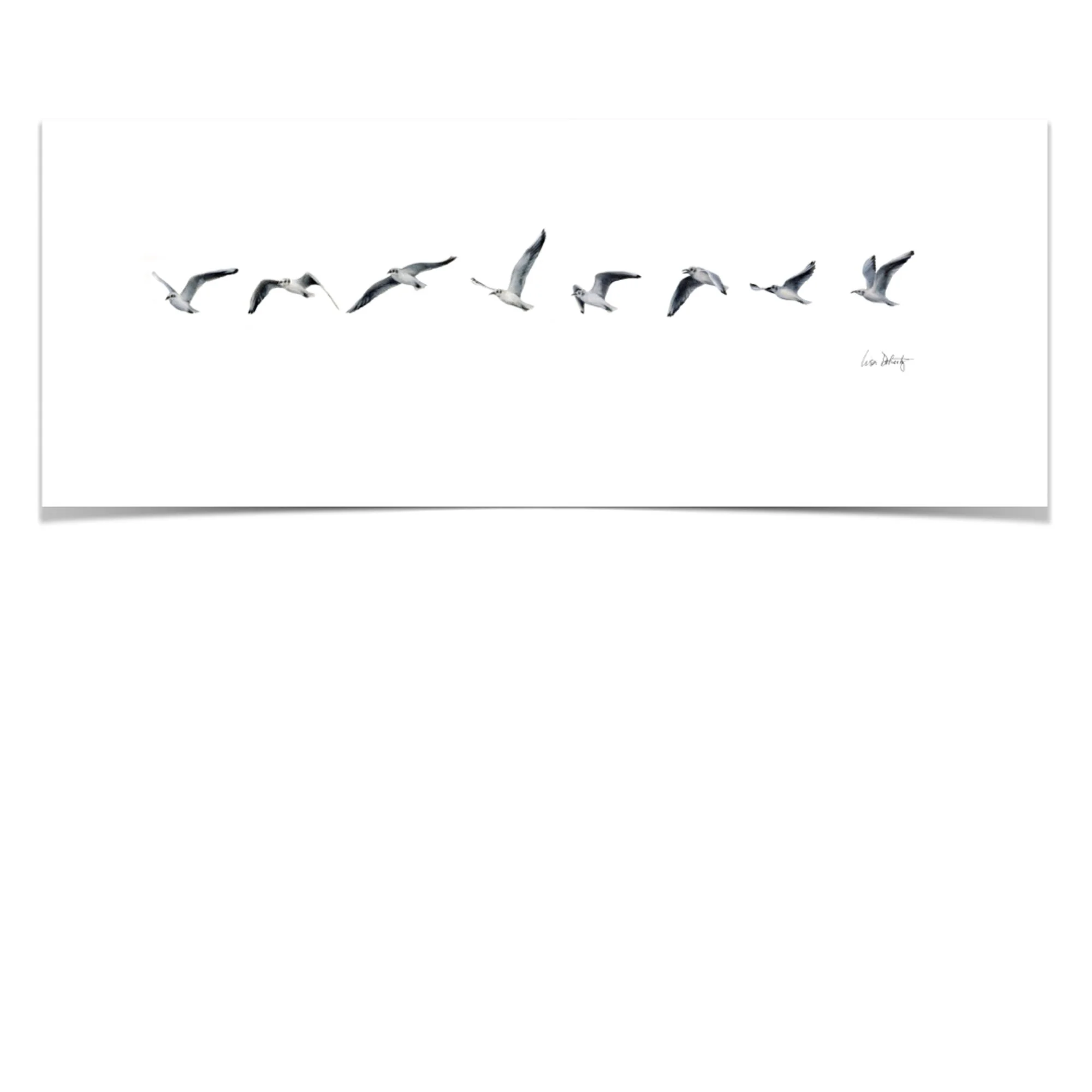 This flotilla of seagulls is available as a custom 8.25” x 22” un-matted print. Open edition Giclee prints are produced on archival 100% cotton matte fine art paper which produces true-to-detail reproductions of the original. Inks are light-fast, archival certified, and will last a lifetime if framed properly and kept out of direct sunlight (as with any piece of art).
